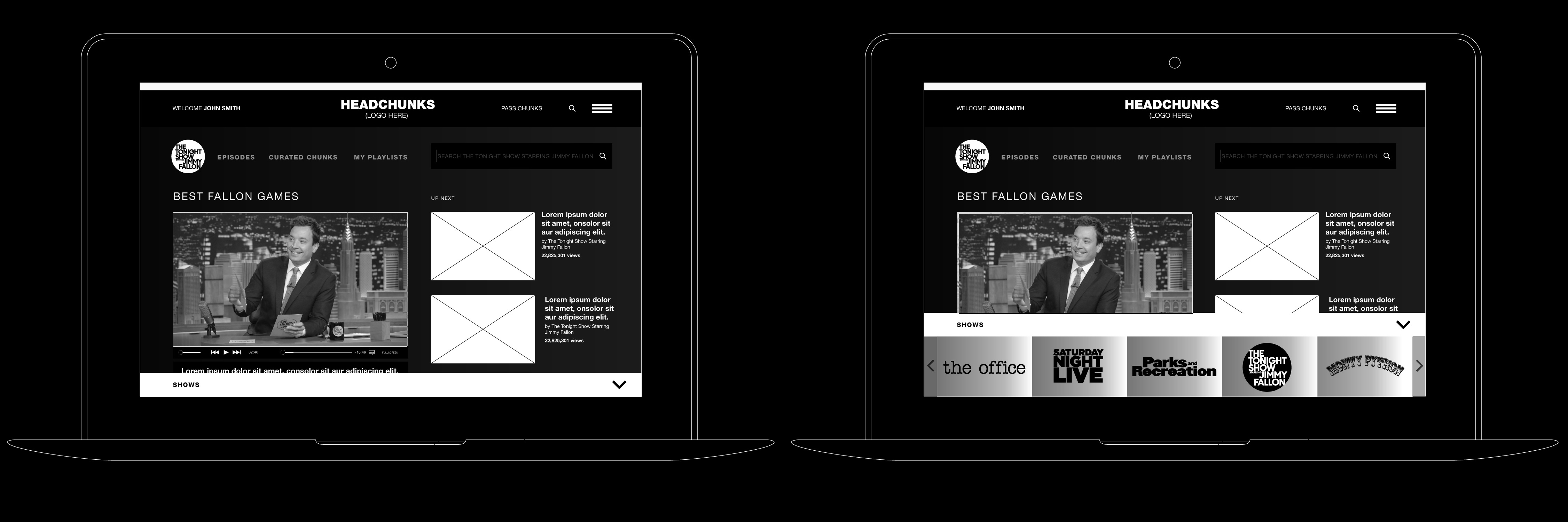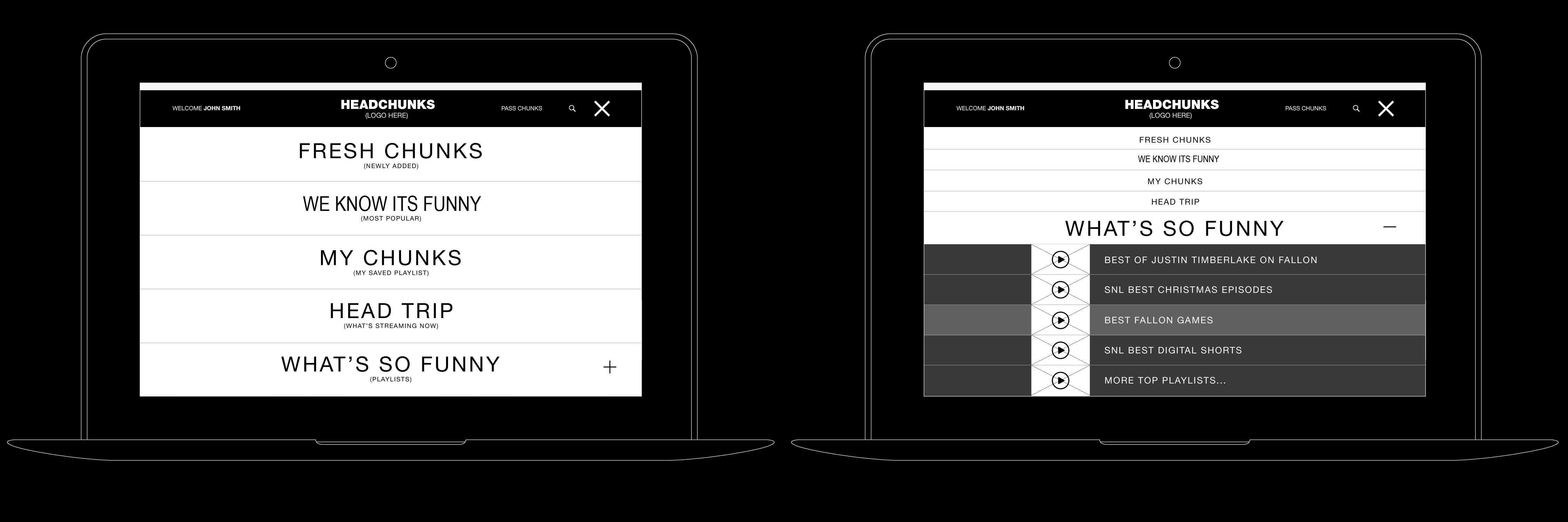 This is the conceptualization/proof-of-concept, prototype development, and preliminary brand identity for an SVOD comedy app by NBC called Headchunks. Eventually it launched under the name SeeSo. This served as a strategic precursor to Peacock.