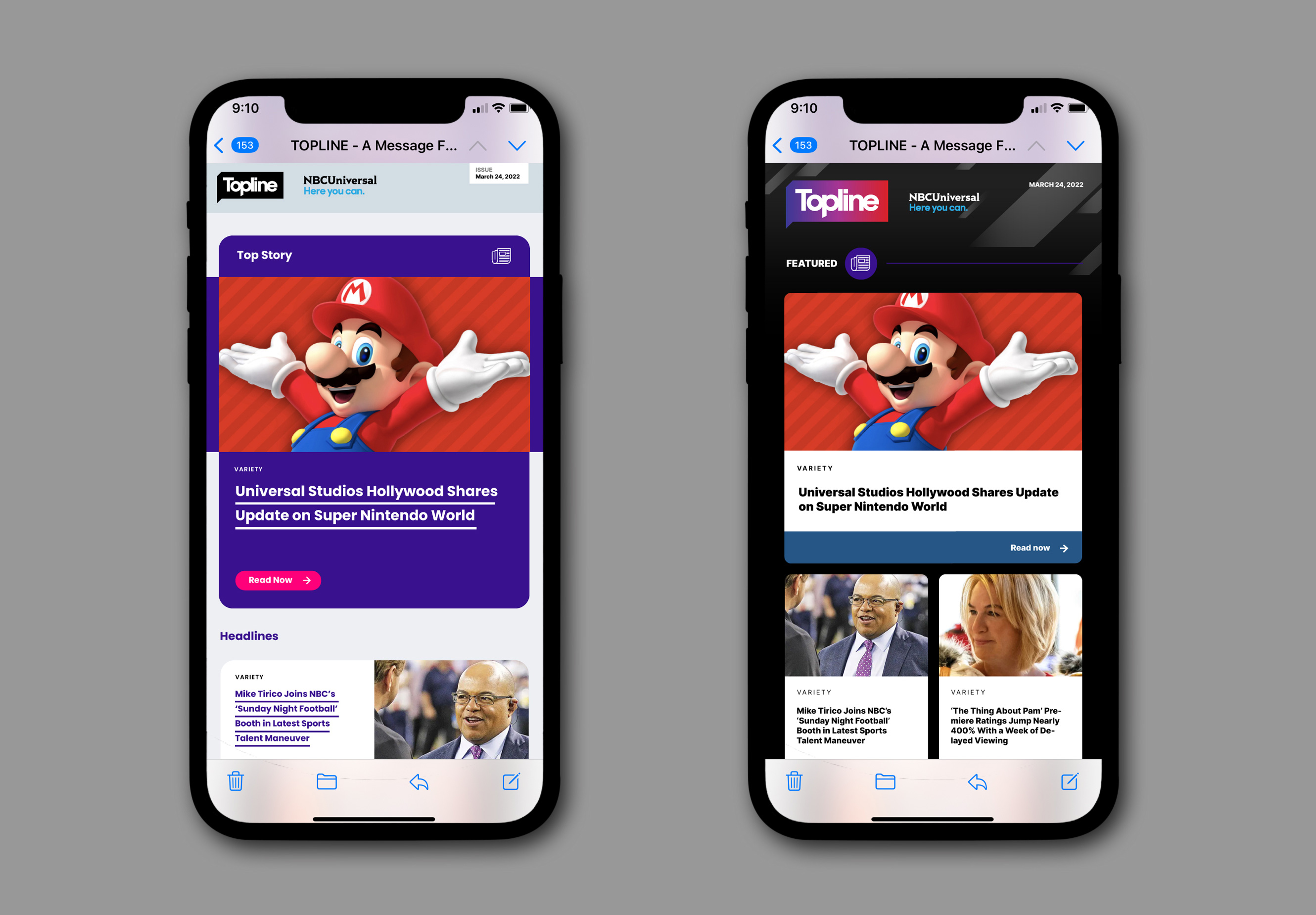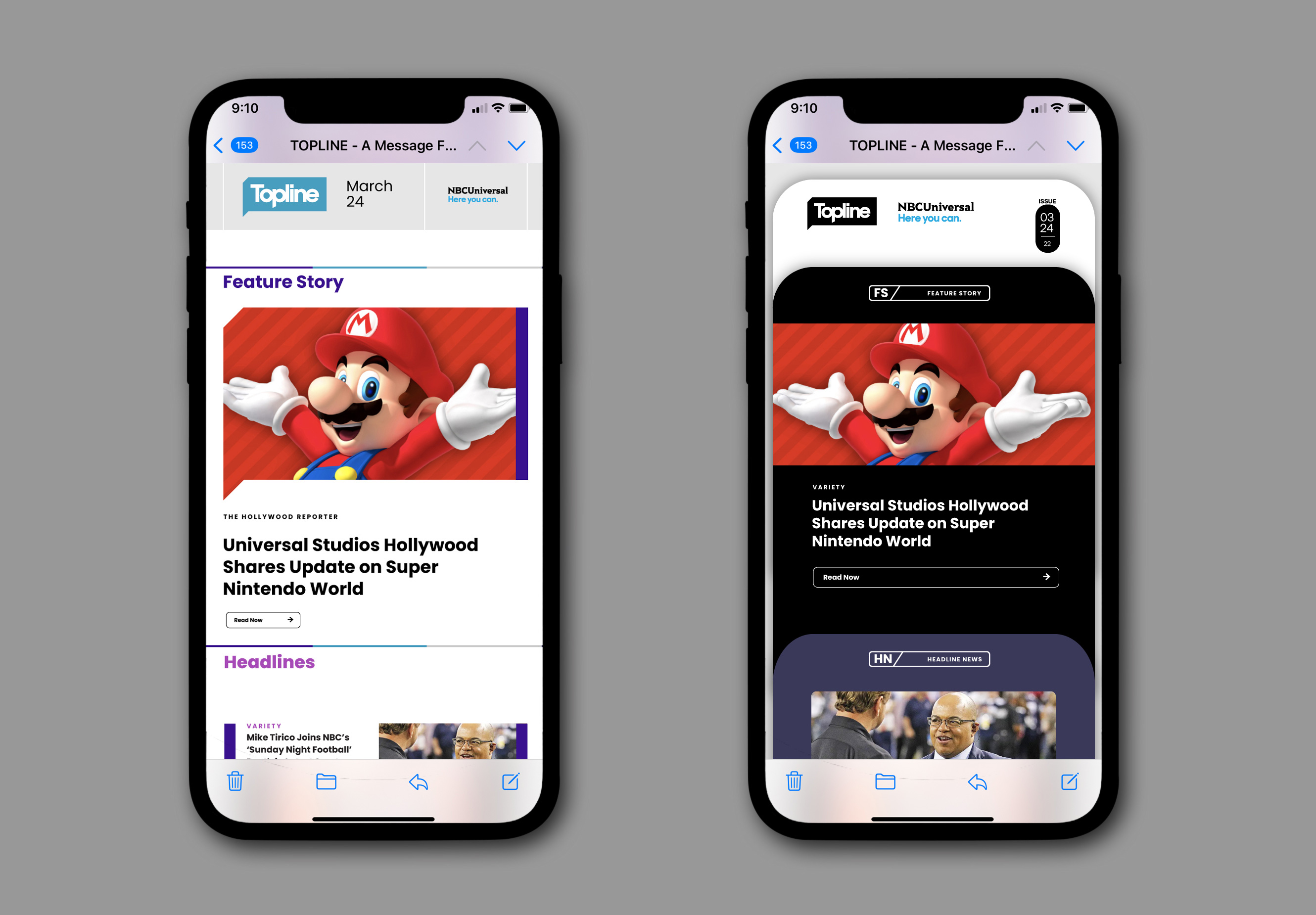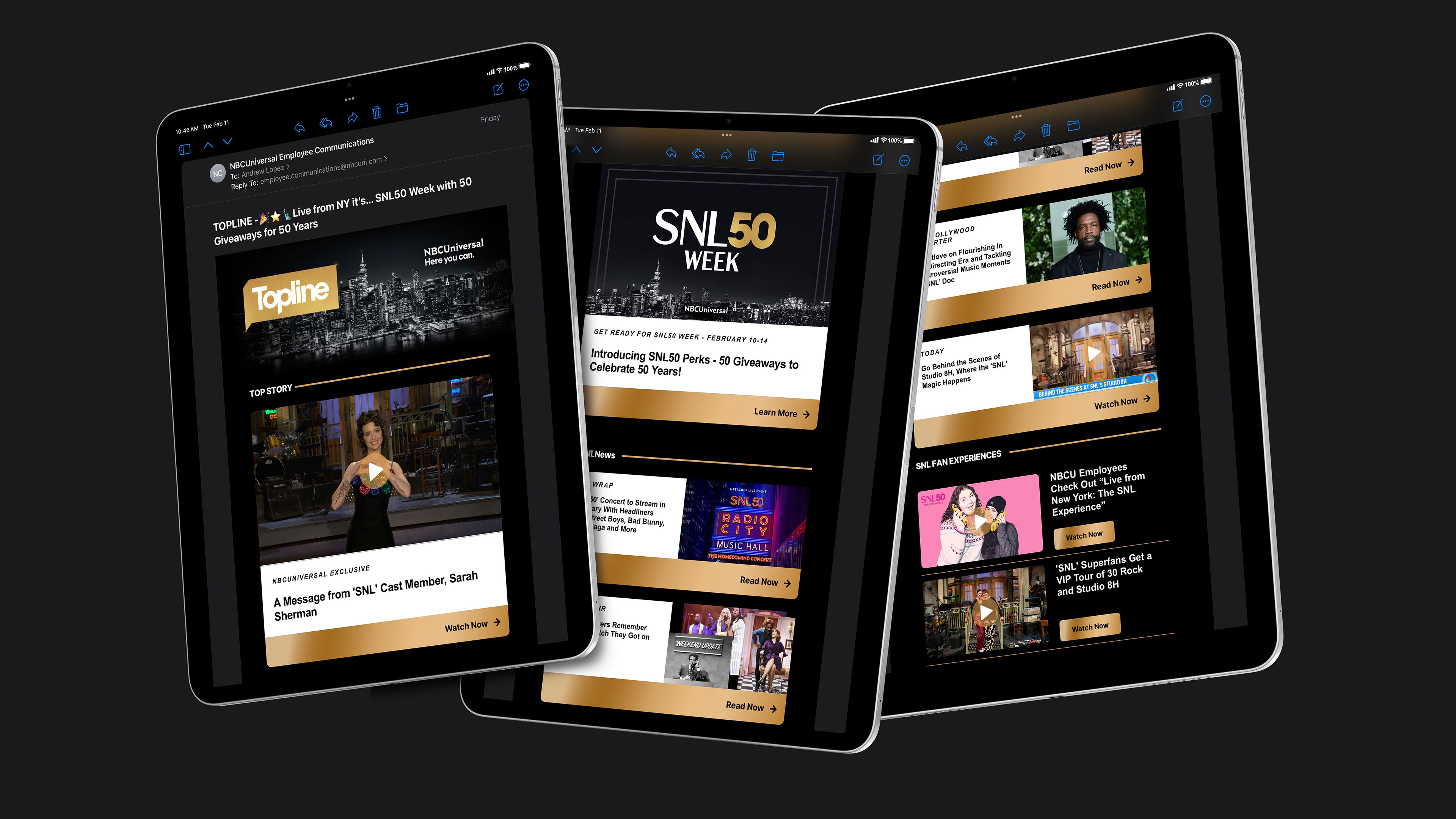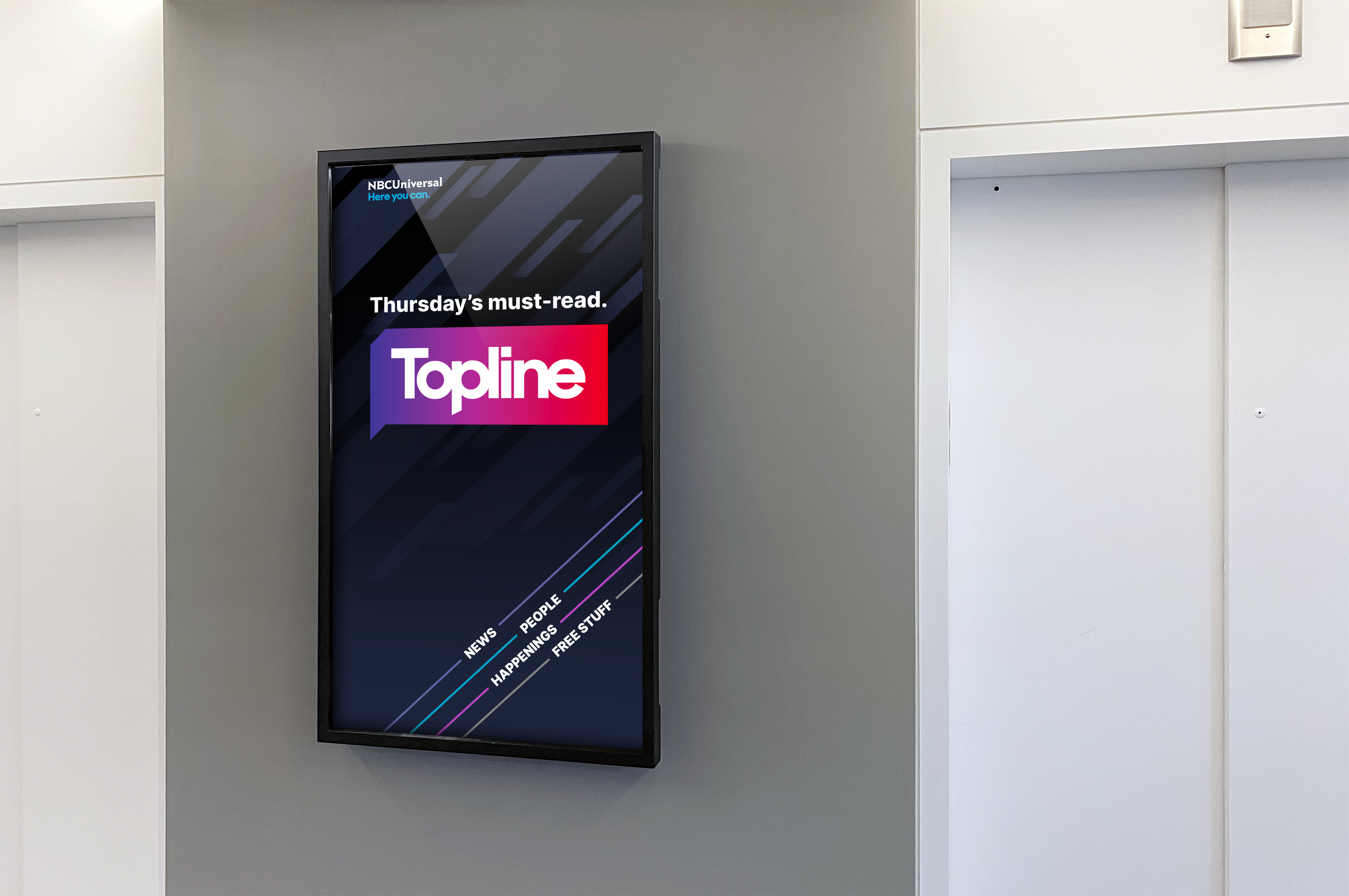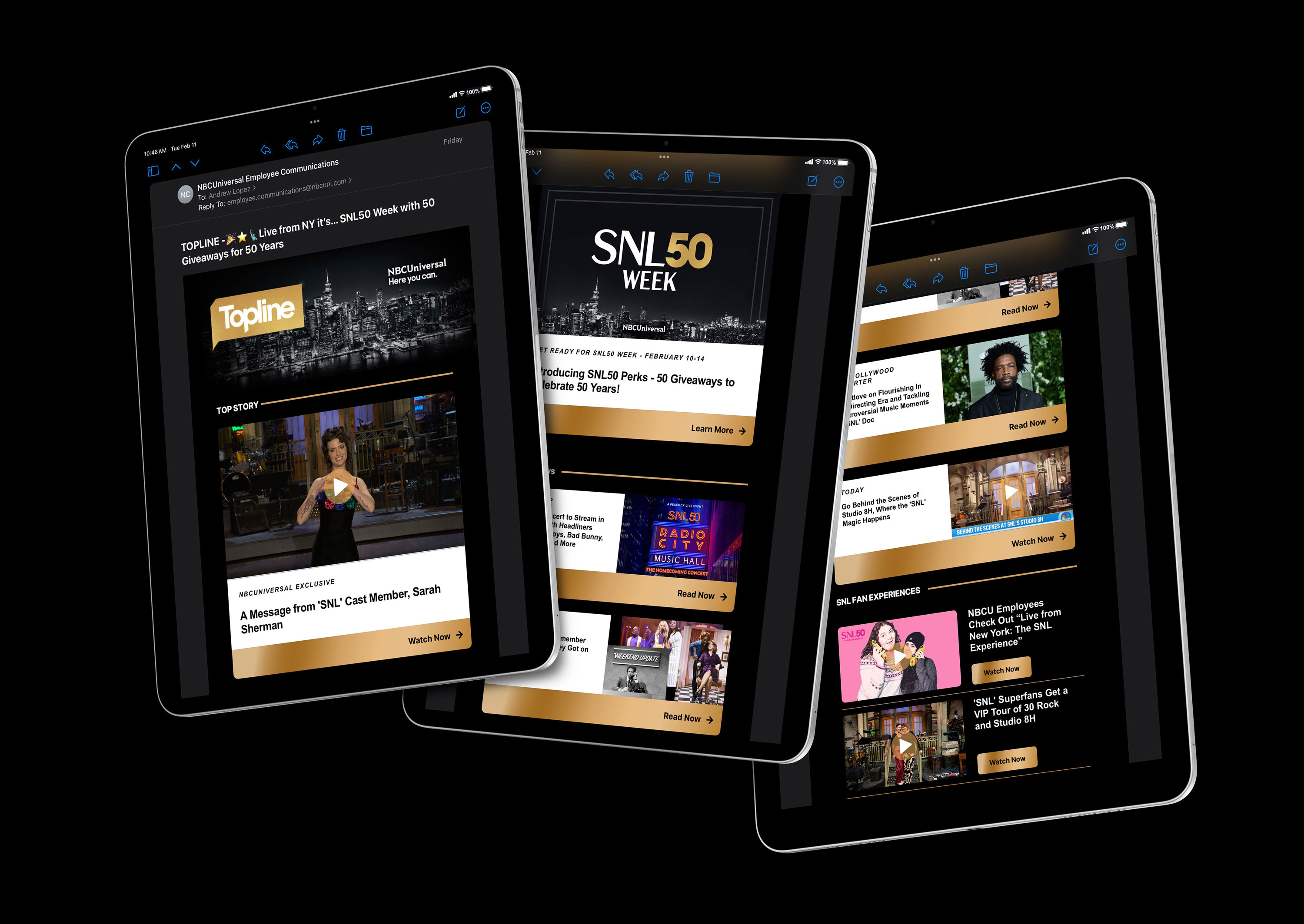 Our strategic approach addressed two key challenges: the technical limitations of email design, particularly concerning Microsoft Outlook compatibility across various devices, and the need to align the design with the dynamic nature of the entertainment industry while effectively engaging NBCUniversal's internal audience. We successfully delivered a solution that met these requirements. Subsequent campaign initiatives included digital advertising on internal elevator screens and a proposed employee engagement tote bag.